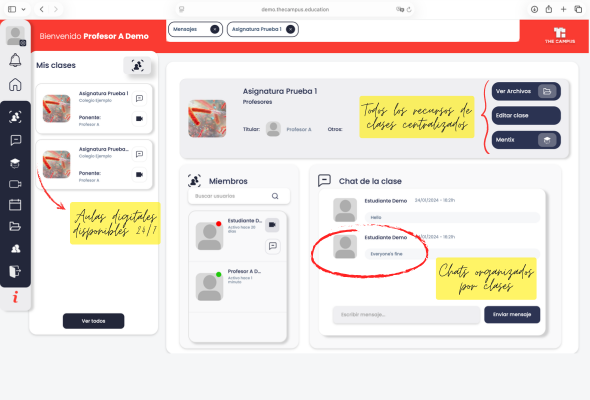 The Campus ofrece un espacio unificado donde alumnos y profesores interactúan en tiempo real sin fricciones.